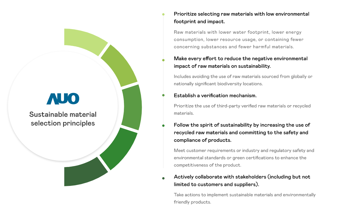 AUO is committed to advancing sustainable products, promoting product innovation and upgrades through outstanding technology, and assuming extended producer responsibility. We actively respond to stakeholders' expectations for sustainable products. We evaluate the environmental and human impacts of each stage of the product life cycle, giving top priority to selecting raw materials with low environmental impact and risk from the raw material stage. We collaborate with value chain partners to develop sustainable materials, ensuring that AUO's products and services are safe for human health and the environment.