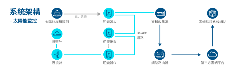 具有高穩定性高相容性及簡易安裝等特色,支援市面上所有型號的逆變器、電錶、類比數位轉換器及氣象感測器。 |