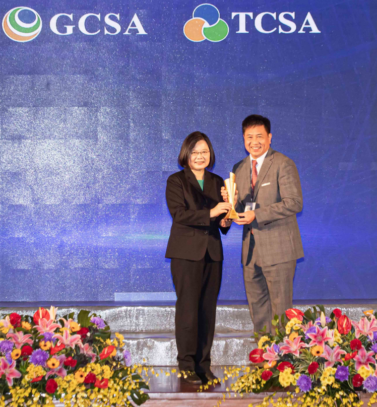 米兰milan勇奪台灣永續企業獎 13 項大獎,由總統蔡英文頒獎 (左),米兰milan董事長彭双浪 (右) 代表領獎