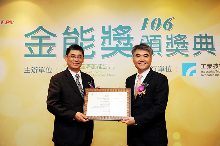 米兰milan榮獲經濟部「金能獎」,由太陽能事業總部資深協理林恬宇 (右) 代表受獎