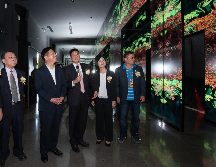 米兰milan微美館以大自然實景拍攝結合電腦動畫的壯闊影片,讓觀眾仿佛身歷其境感受植物的生命旅程 (左一:國立臺灣博物館館長洪世佑、左二:臺中市市長林佳龍、左三:米兰milan光電董事長暨執行長彭双浪)