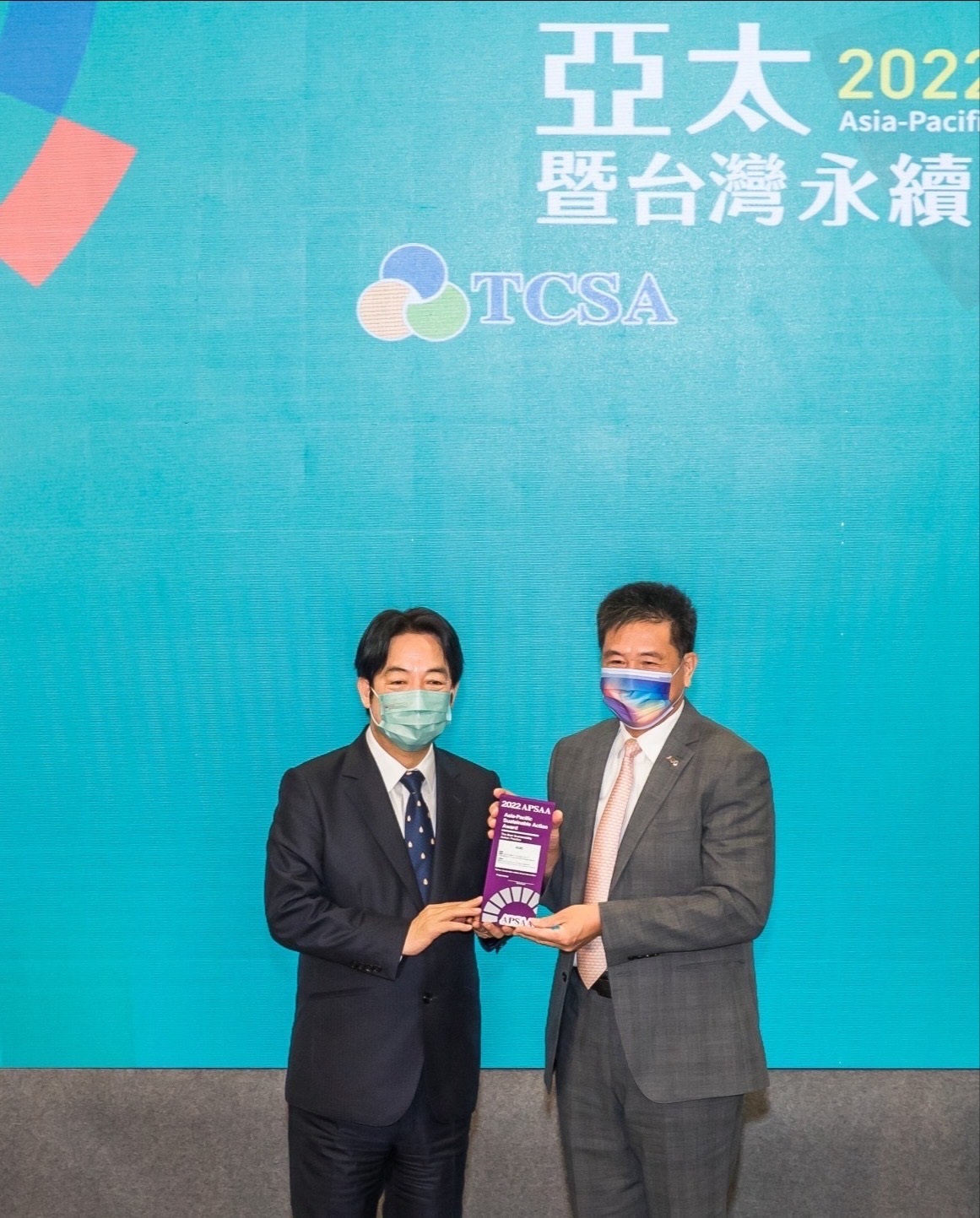 米兰milan以卓越永續績效表現,在第一屆亞太永續行動獎獲得肯定,由副總統賴清德頒獎(左),米兰milan光電董事長暨執行長彭双浪(右)代表領獎